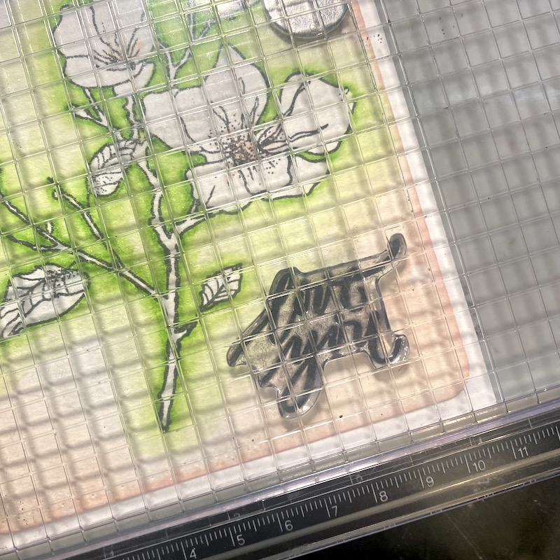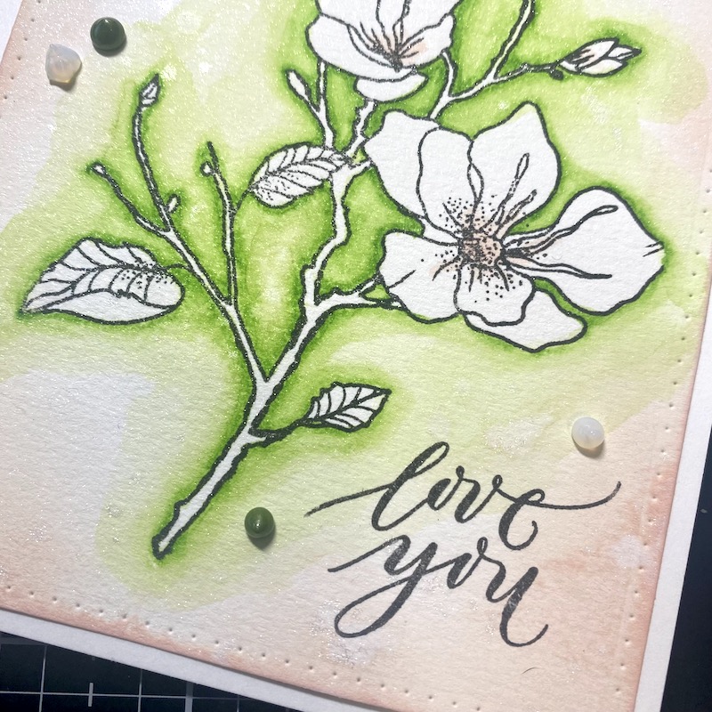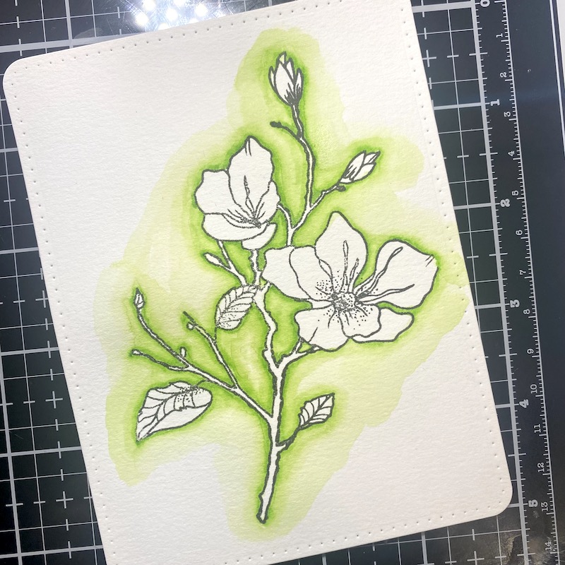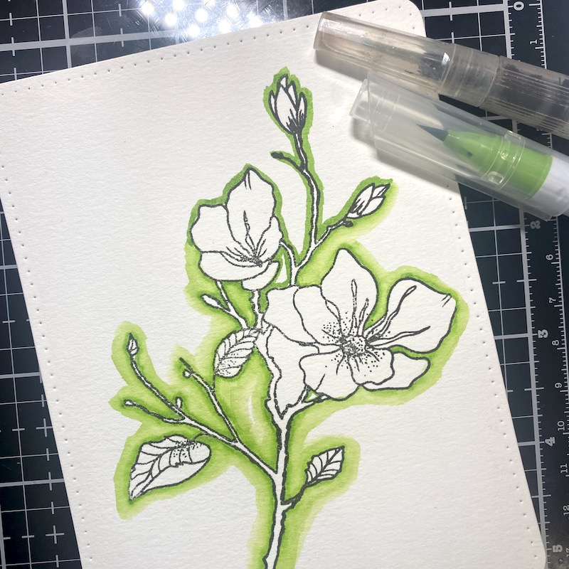 Step Three: Using a watercolor marker, out line the stamped image and push the color out with a water brush. I used Leaf Green Zig Clean Color Real Brush Marker.