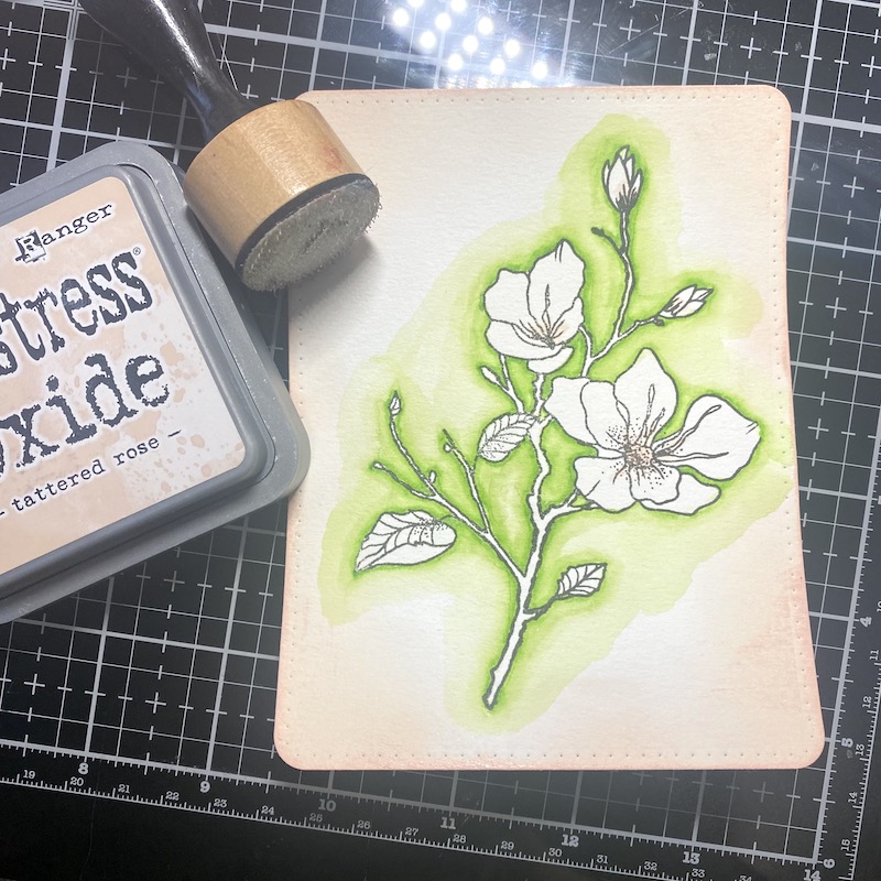 Step Six: Blend ink around the edges of the cardstock. I used Tattered Rose Distress Oxide.