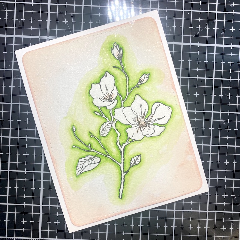 Step Seven: Spray and splatter the watercolor paper with a shimmer spray. I used Shimmer Craft Spray in Frost. Using 10mm Clear Double Sided Adhesive, adhere the cardstock to an A2 card frame.