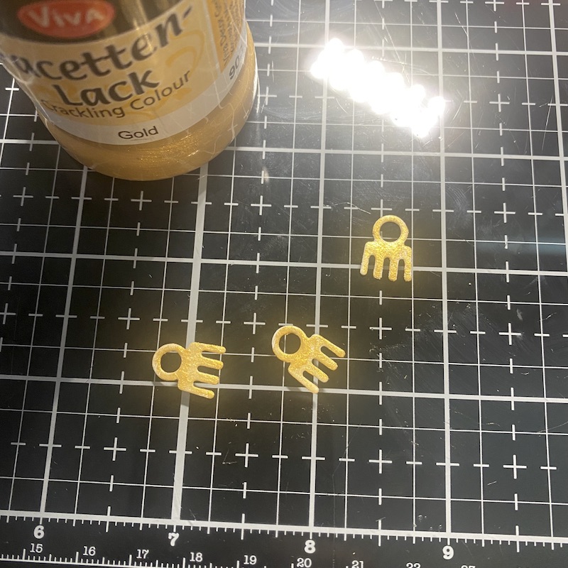 Step Two: Die cut two sets of ornament clasps. Paint one set with Gold crackling paste. Adhere to the front of the die cut ornaments with a liquid adhesive.