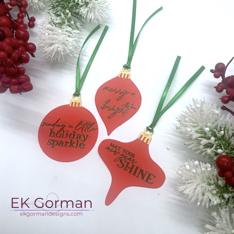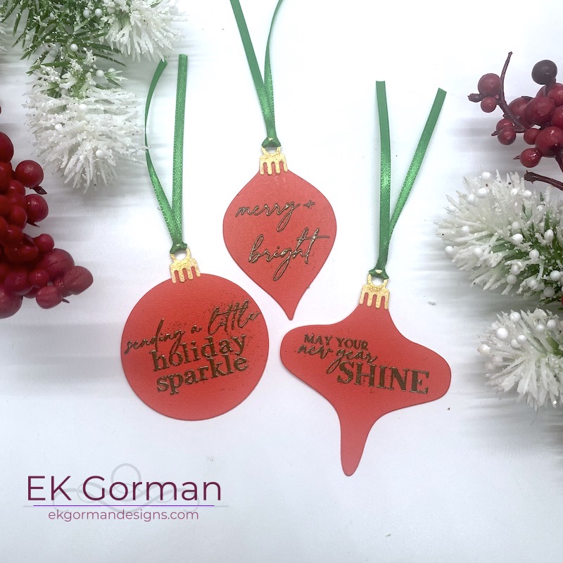Step Four: Heat emboss green embossing powder sentiments onto the die cut ornaments from the Holiday Sparkle sentiment stamps.