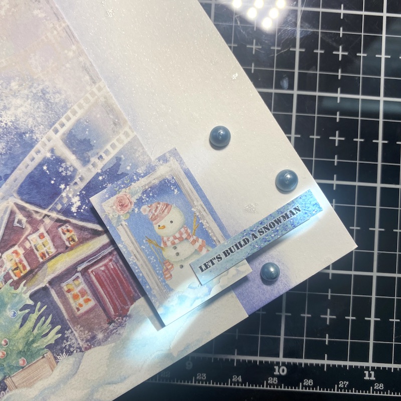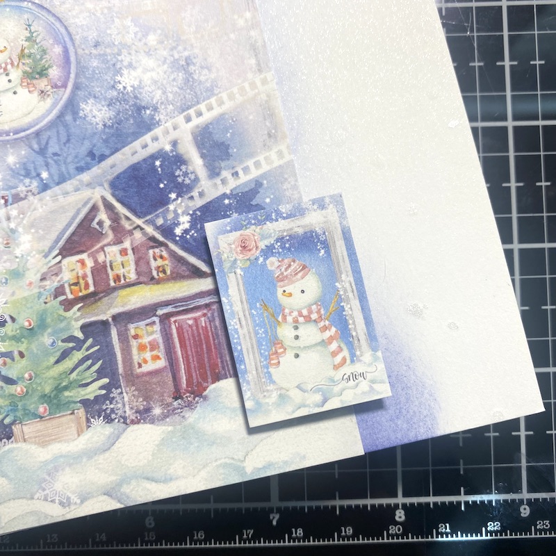Step Three: On an A2 card frame, blend a line of blue ink down the middle. I used Chipped Sapphire Distress Oxide. Spray the card frame with Shimmer Craft Spray in Frost to create a winter feel. Adhere the snow cottage image to the card frame using double sided tape.