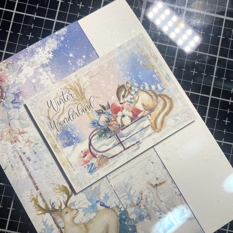 Step Seventeen: Trim a piece of printed paper to 4×5.25 inches. Adhere to an A2 card frame using double sided tape.