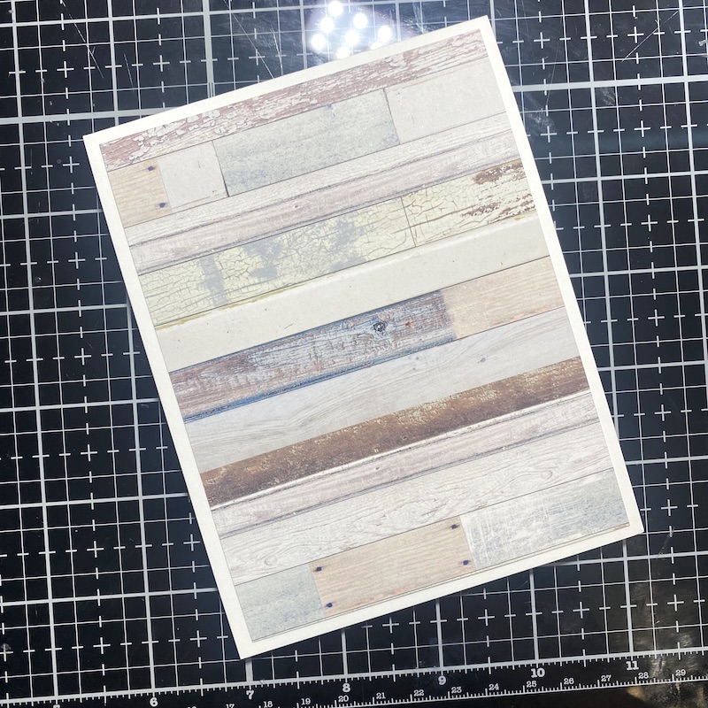 Step Twelve: Trim a piece of wood themed paper to 4×5.25 inches and adhere to an A2 card frame. Adhere using double sided tape.