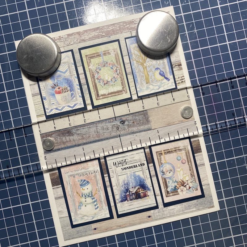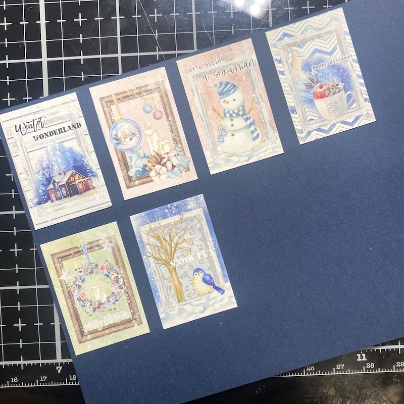 Step Fourteen: Using a dark blue cardstock, add a blue frame around six pieces of trimmed ephemera. Trim the cardstock.