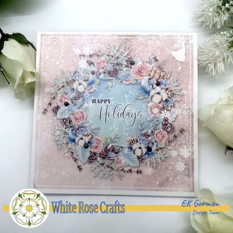 Step Nine: Adhere the wreath piece of cardstock untrimmed to a 6×6 inch card frame using double sided tape. This piece of paper is so beautiful, it does not need to be trimmed to create a beautiful card. In fact most of the pages could easily be there own 6×6 card.