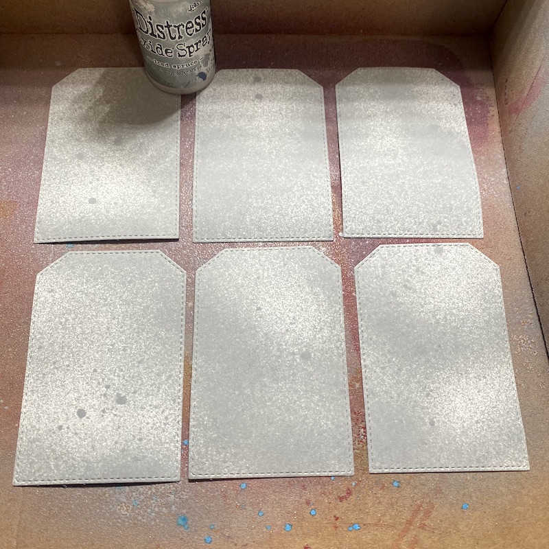Step Two: Heavily spray the tags with some Iced Spruce Distress Oxide Spray.