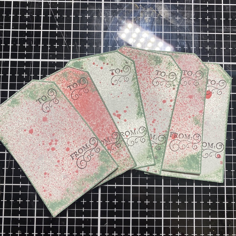 Step Three: Gently spray and splatter the tags with Festive Berries Distress Spray Stain. Let dry.
