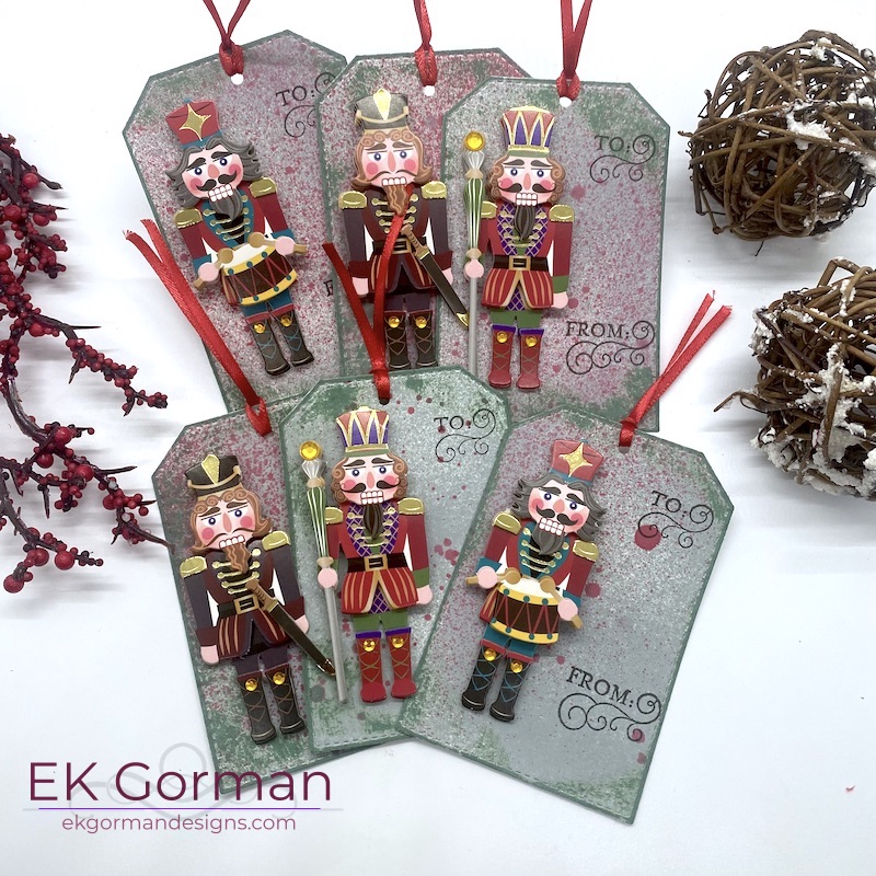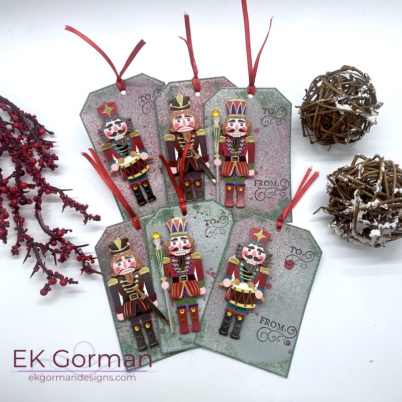 Step Six: I added these nutcracker stickers to finish the tags. I picked these stickers up from a Big Box Store for under 2 bucks for the pack. Finally, I holed punched the top of the tags, and added some ribbon to complete the holiday tag.